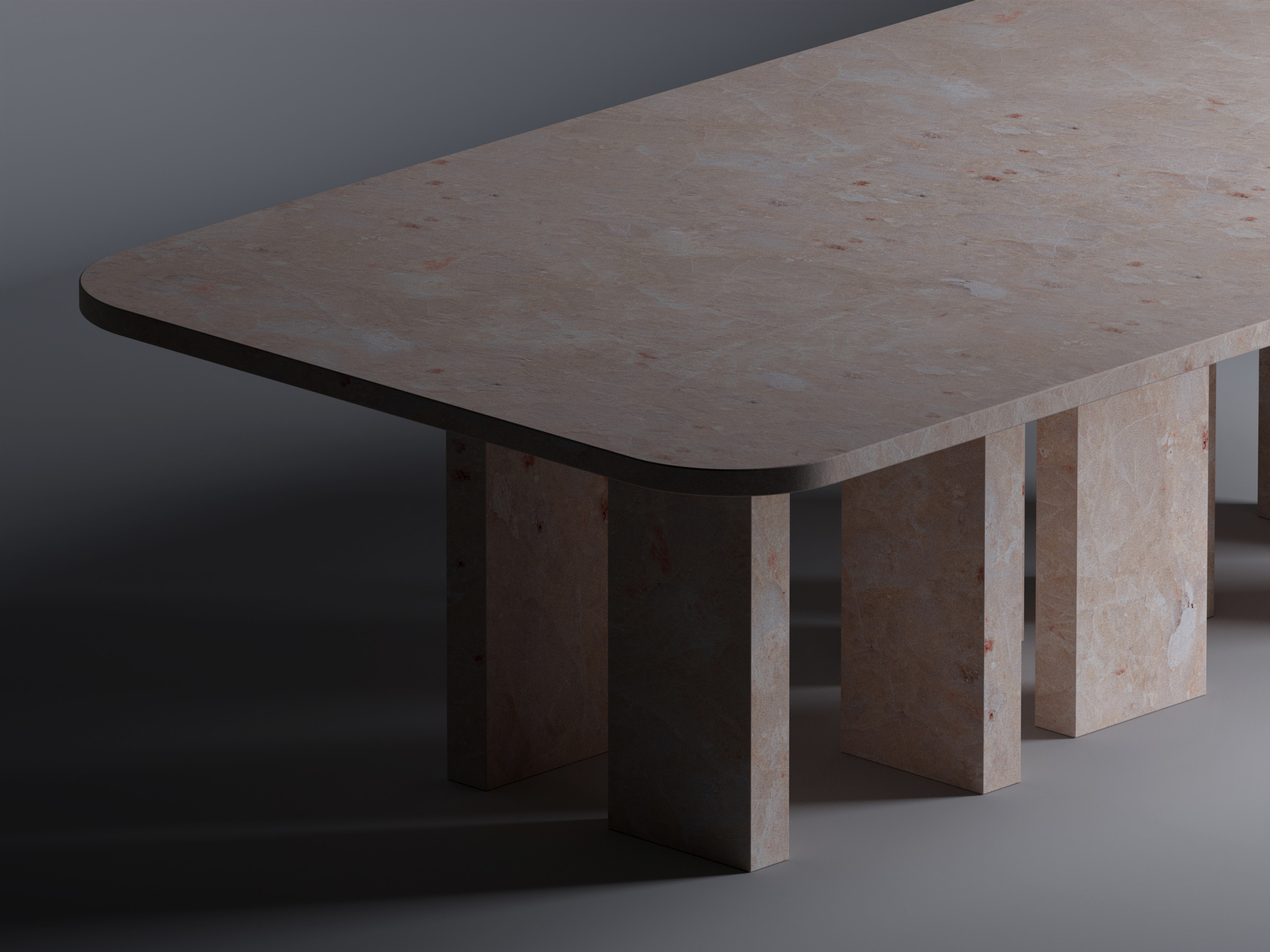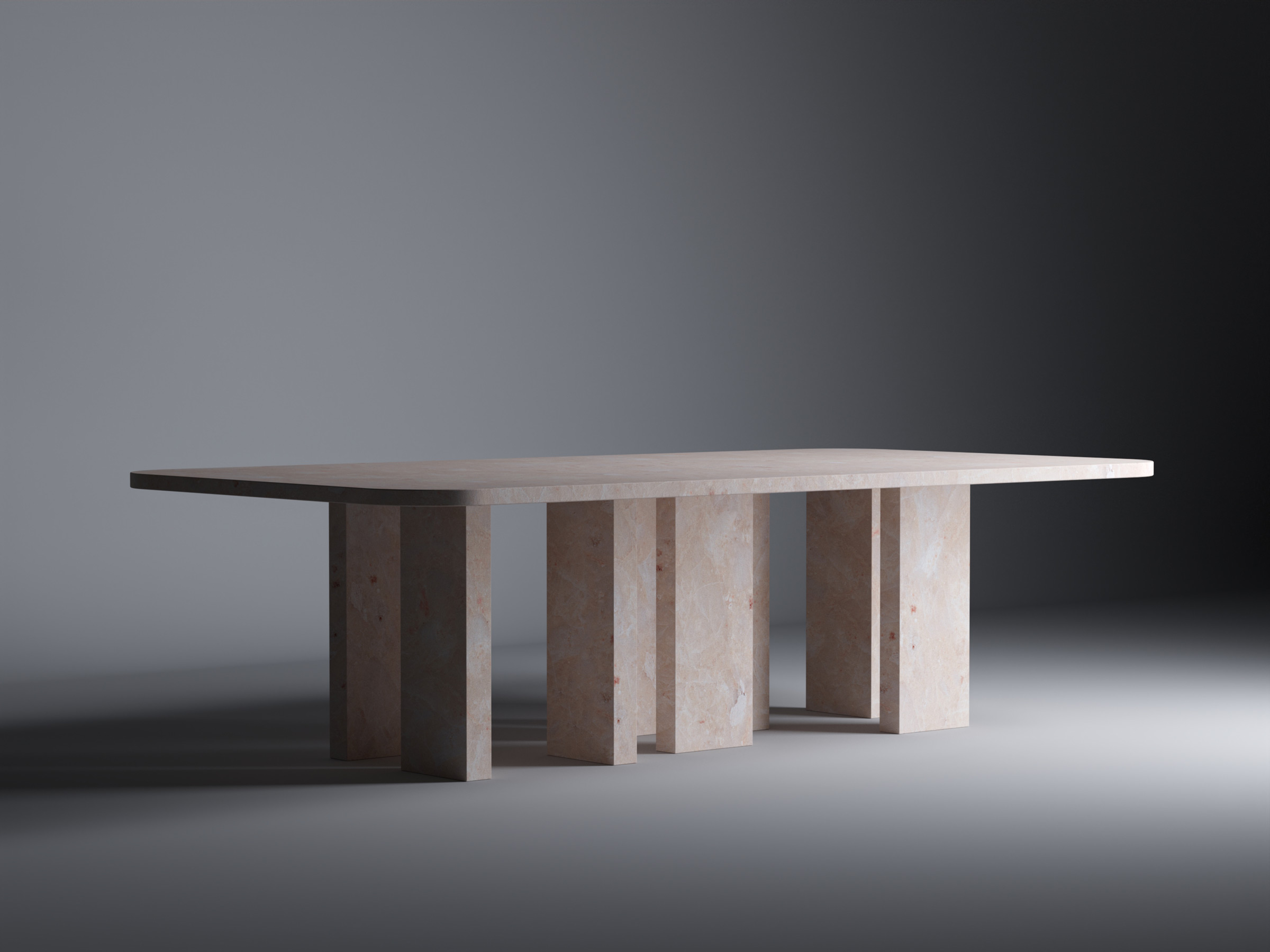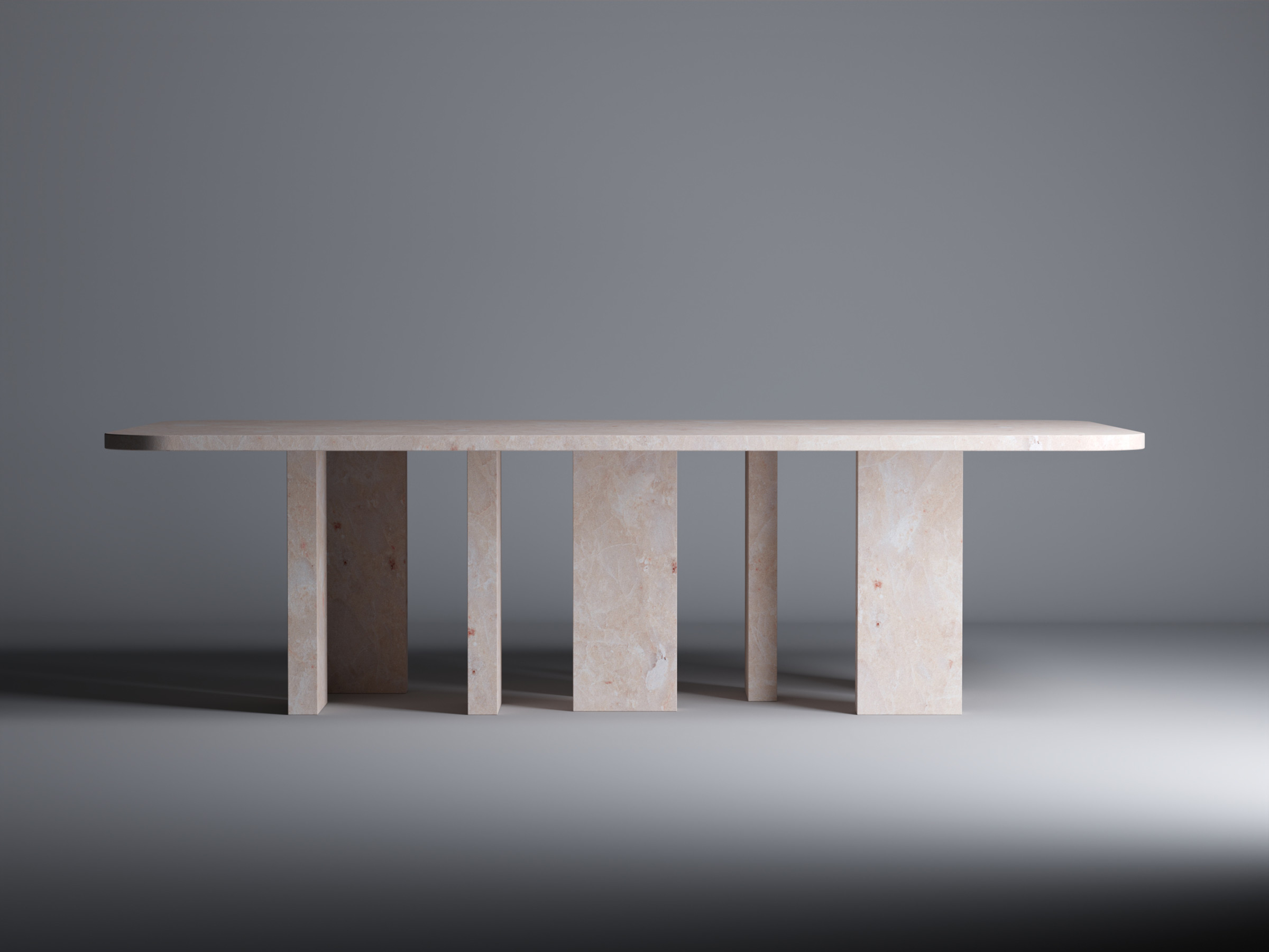 This table gives new life into otherwise wasted materials, embracing their potential and giving them renewed purpose. With its clean geometric design, the table boasts a rectangular top and eight legs composed of vertical slabs arranged in diverse orientations, showcasing the structural challenges of supporting a weighty slab. Made from Red Portuguese Lioz, Brut stands as a testament to both creative design and responsible material usage.