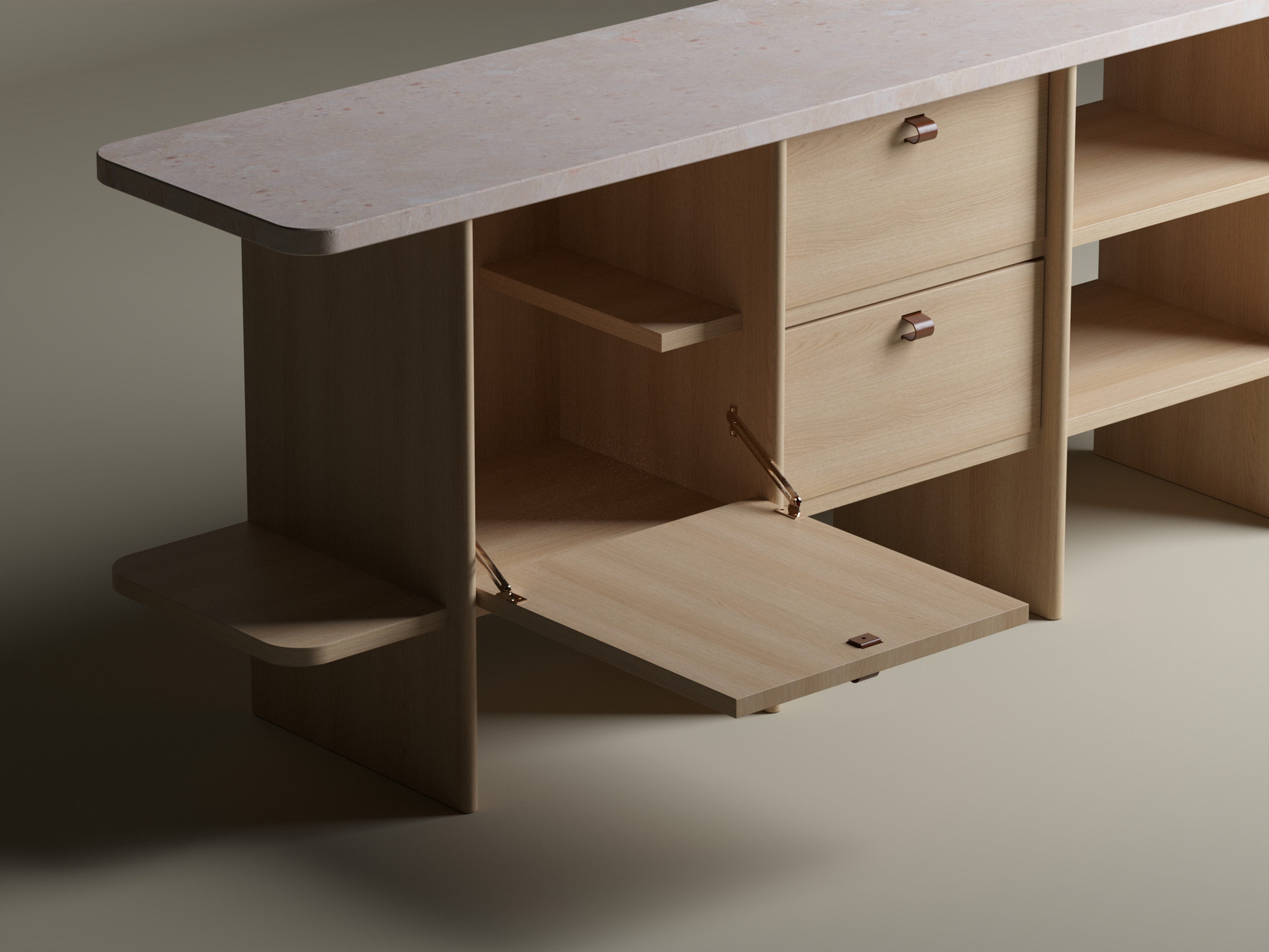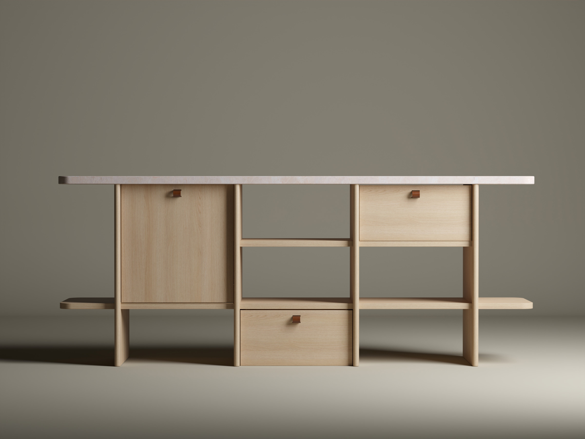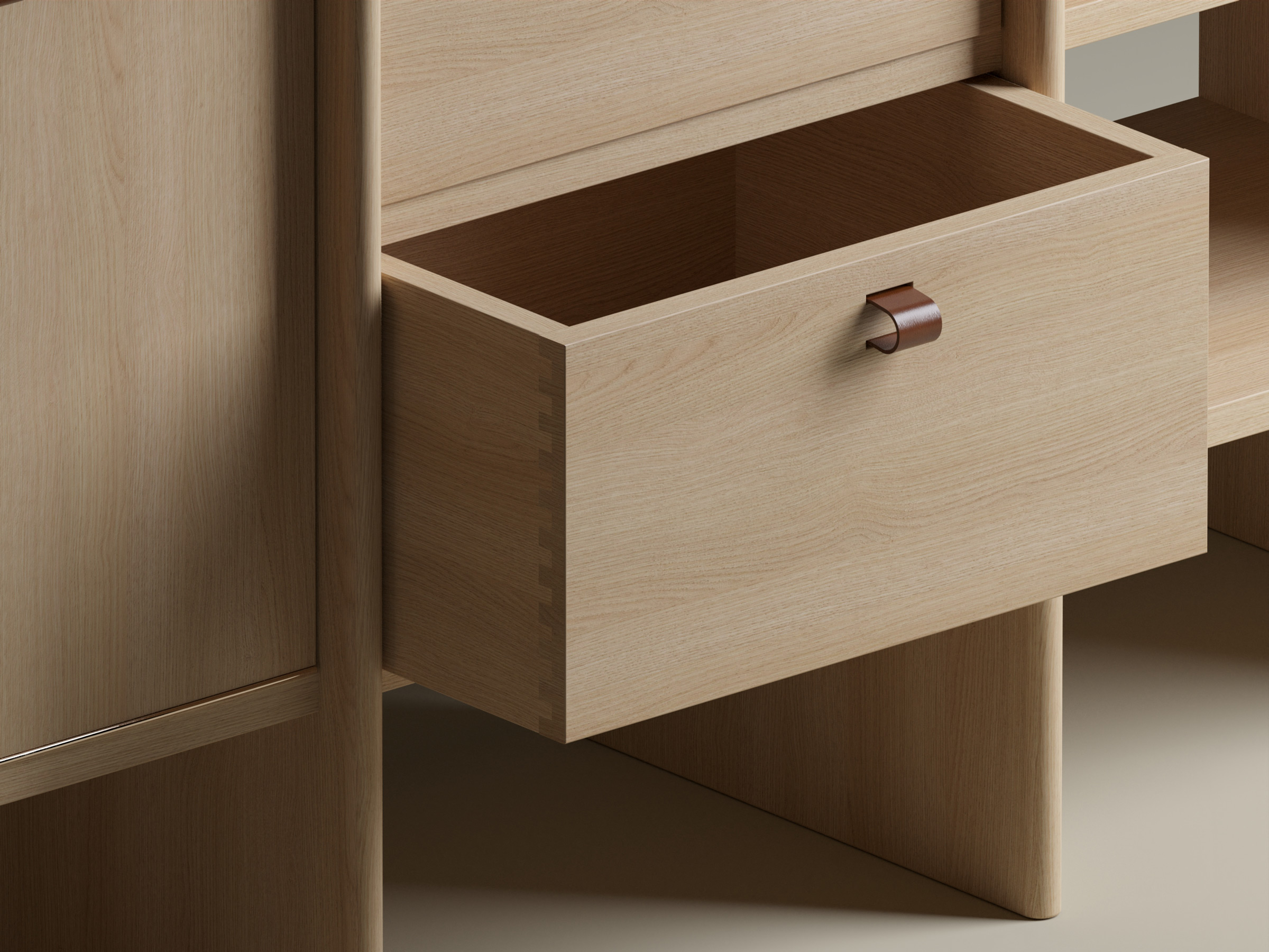It consists of an open grid structure made of wooden sides and crossbeams, providing multiple open spaces within the grid. This opens the possibility of placing the drawers in any of the open spaces, turning the sideboard into a playful and customizable storage solution. Made of solid oak.