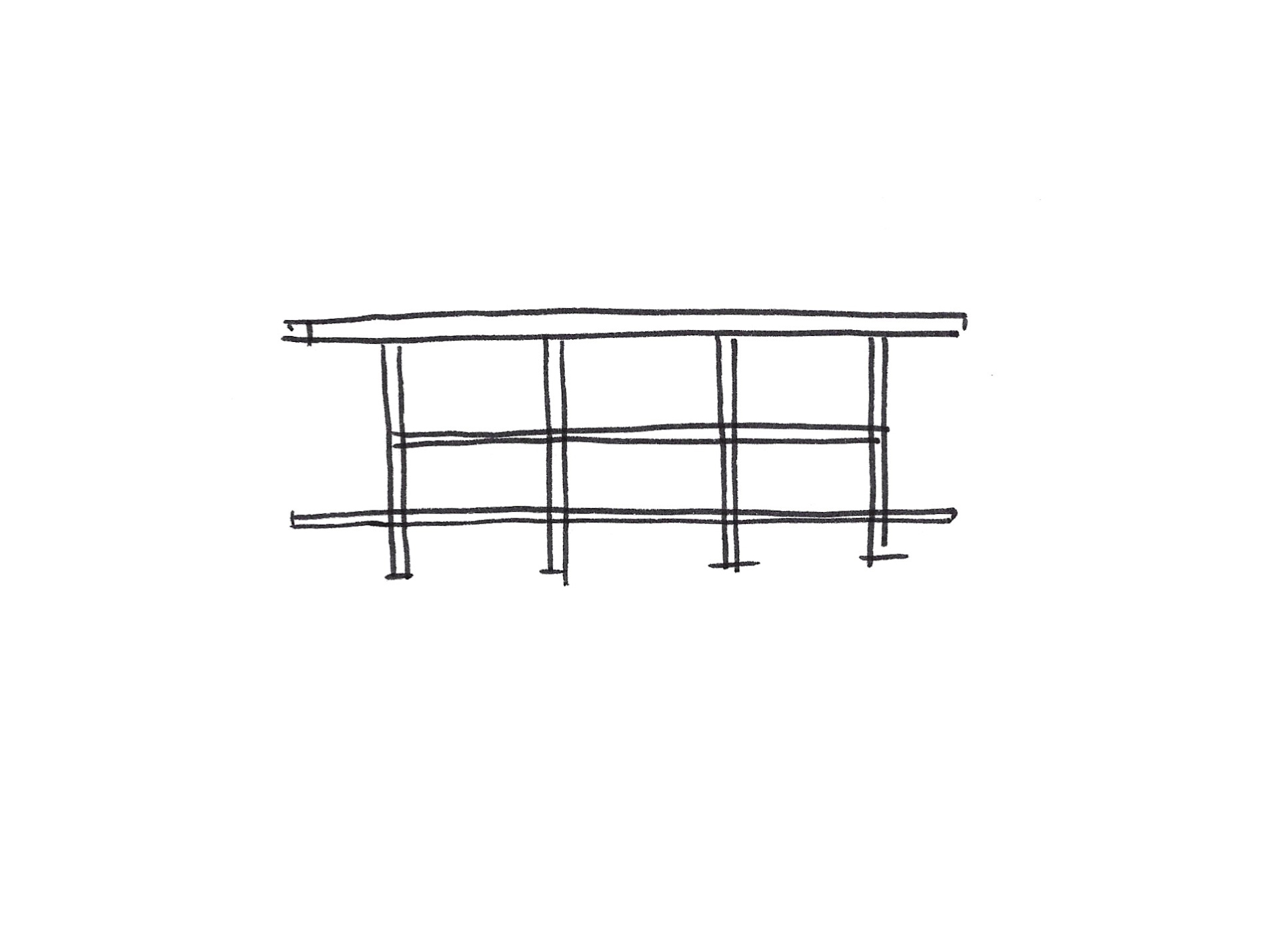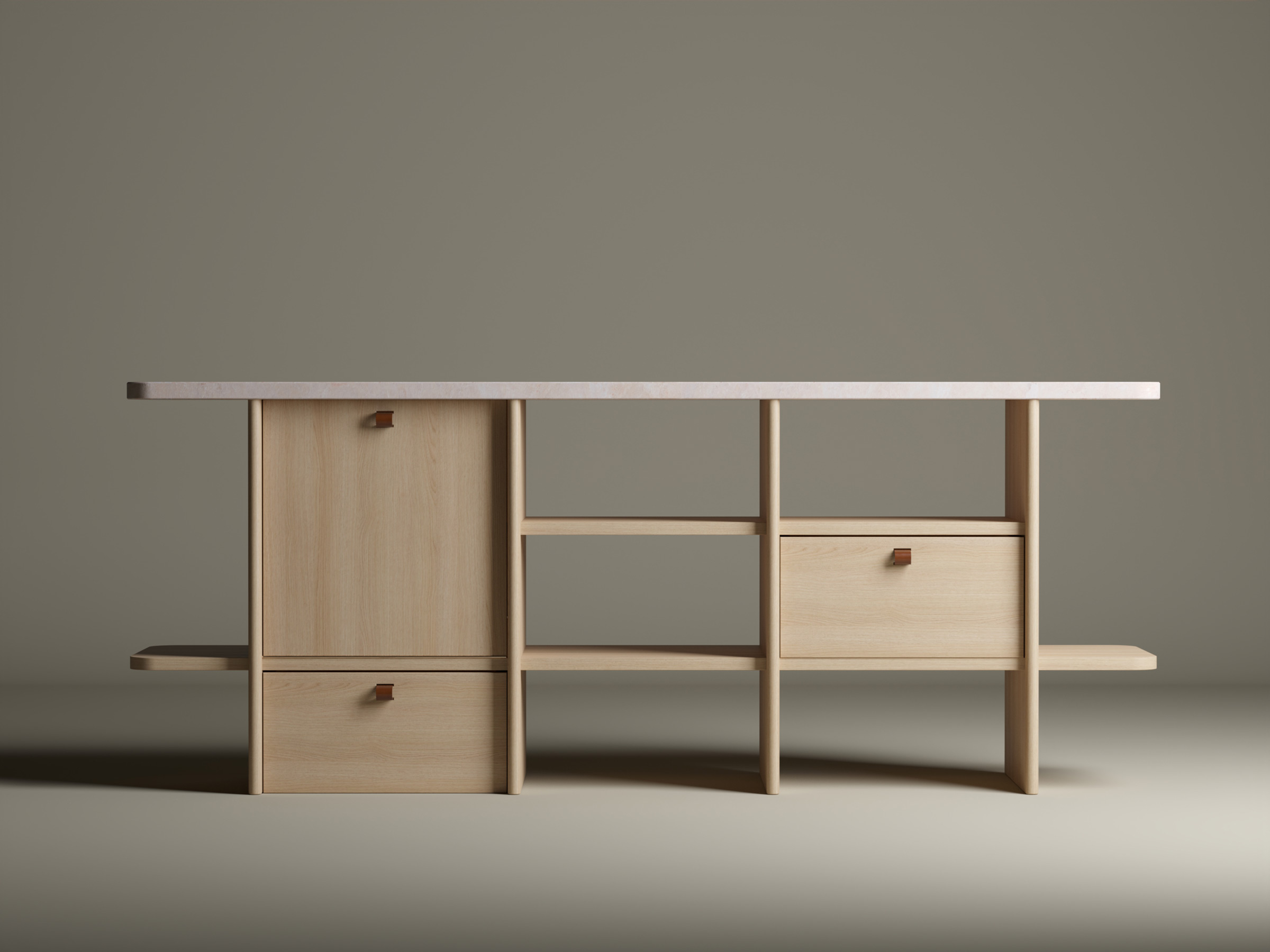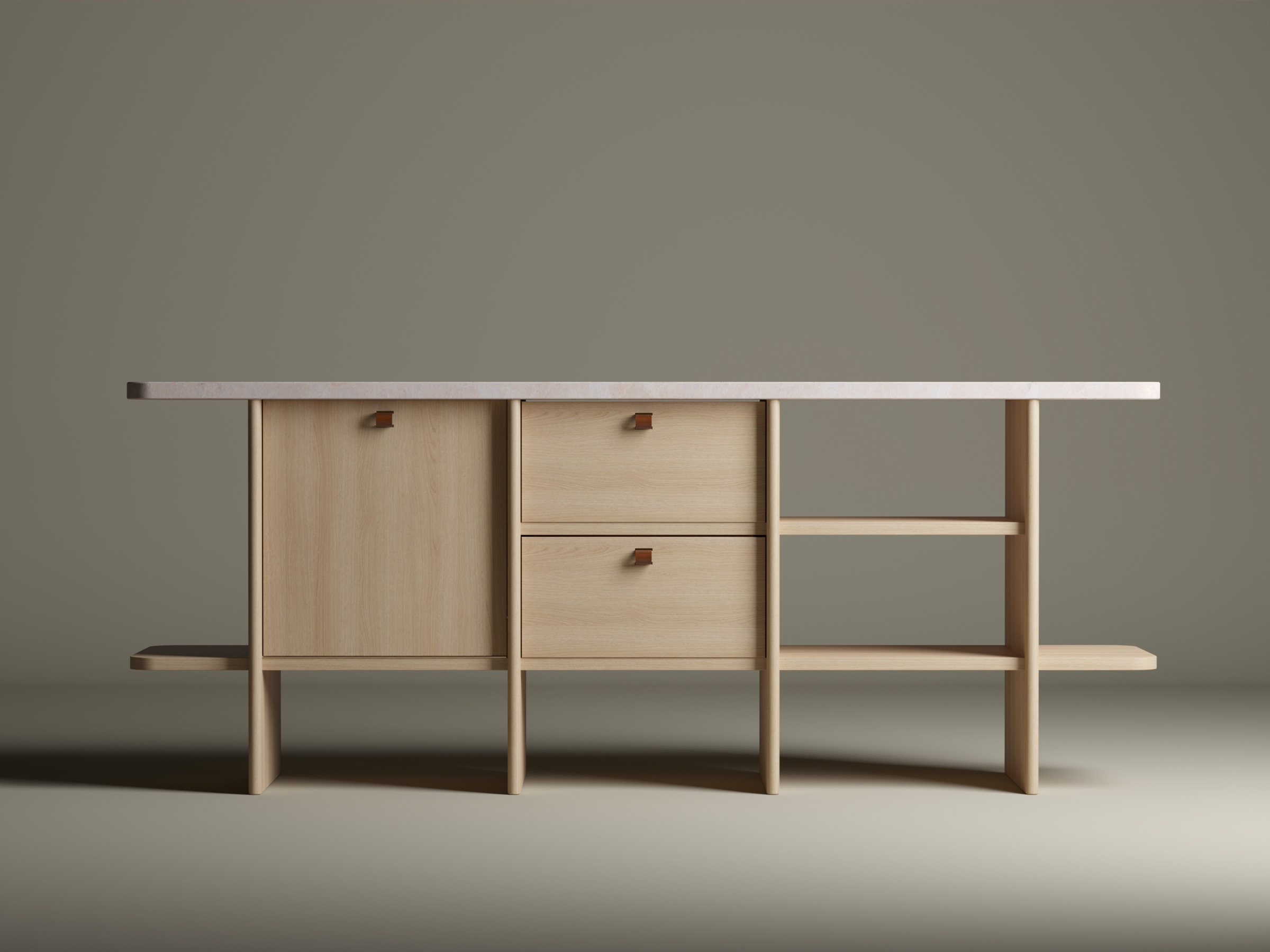It consists of an open grid structure made of wooden sides and crossbeams, providing multiple open spaces within the grid. This opens the possibility of placing the drawers in any of the open spaces, turning the sideboard into a playful and customizable storage solution. Made of solid oak.
